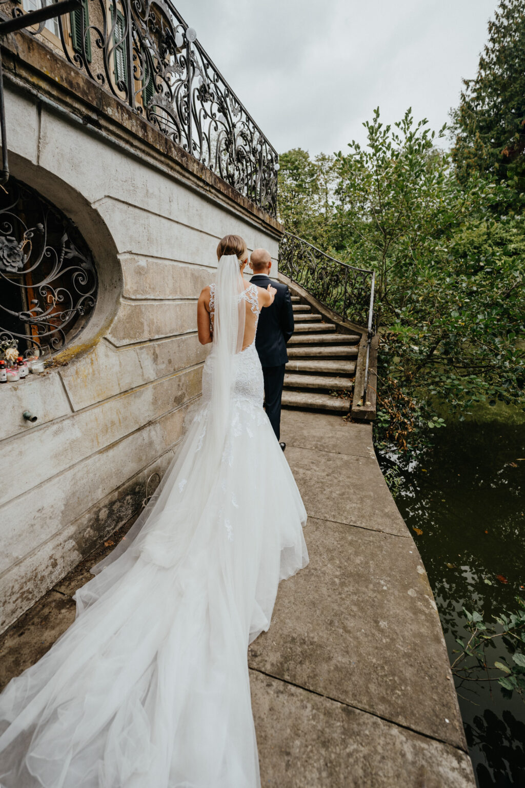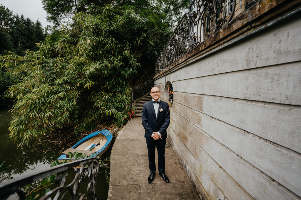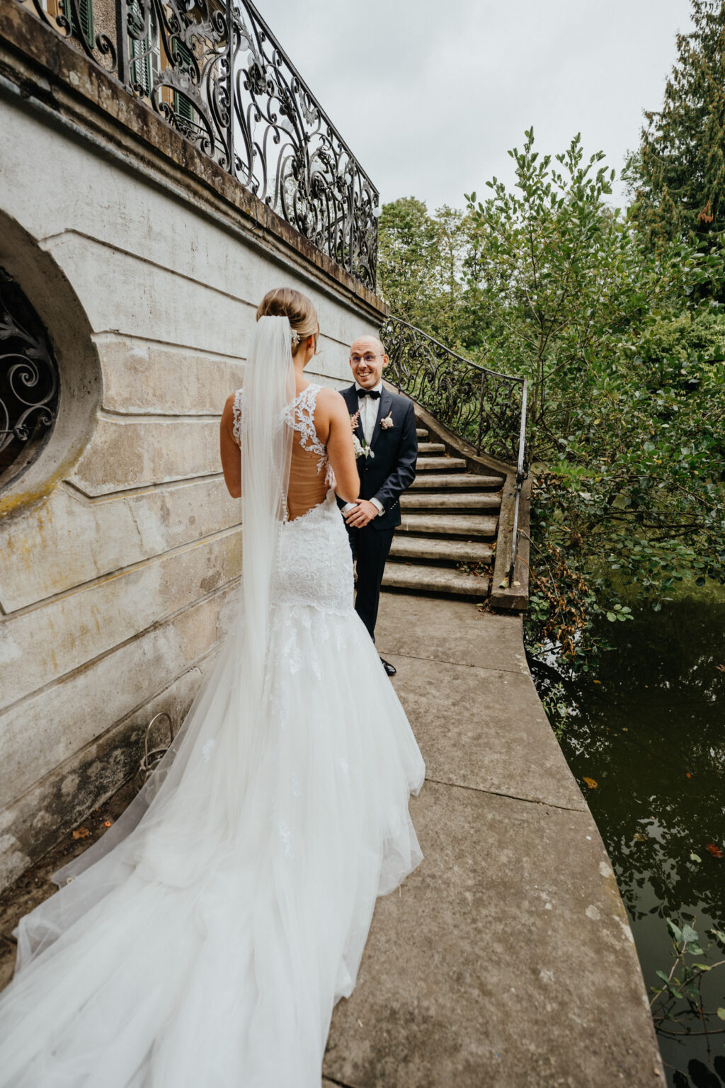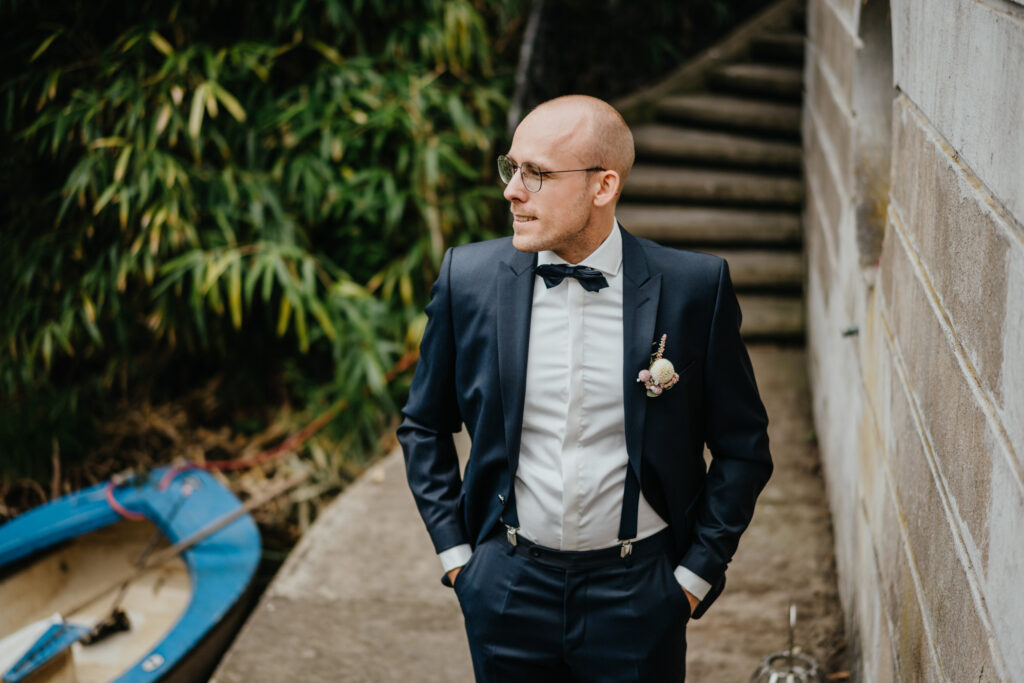 Die zwei haben sich für ein First Look Shooting entschieden also bin ich mit Kevin auf die Terrasse gegangen und diesen kleinen Steg gesehen. Perfekter Ort für “das erste Sehen”. Nur ich sollte etwas aufpassen sonst lande ich im Wasser.