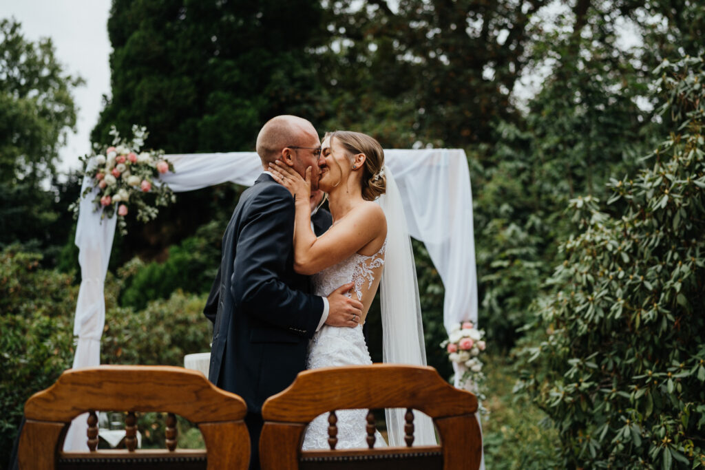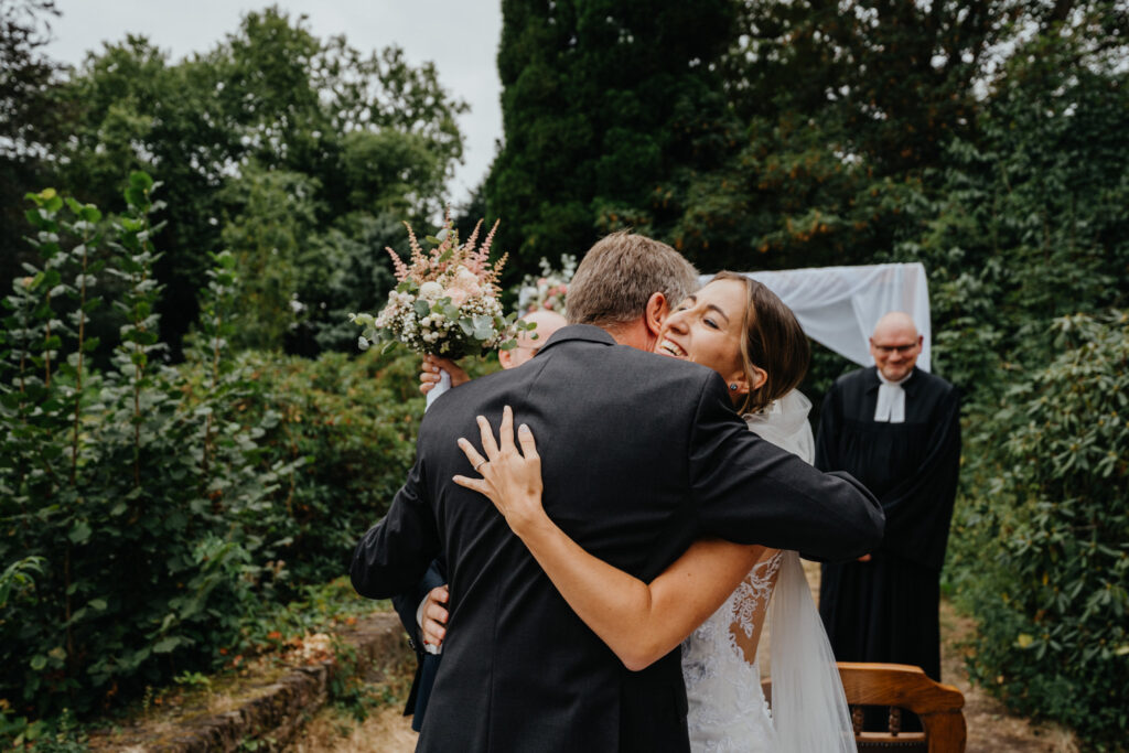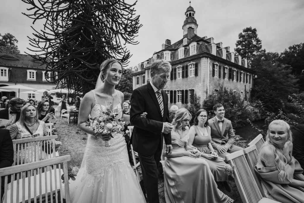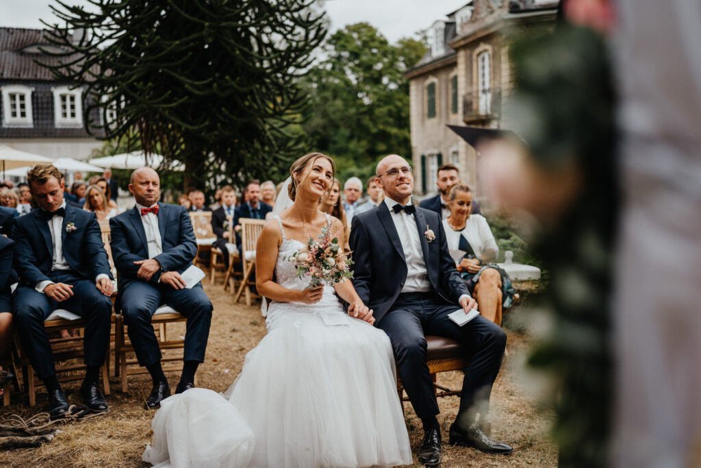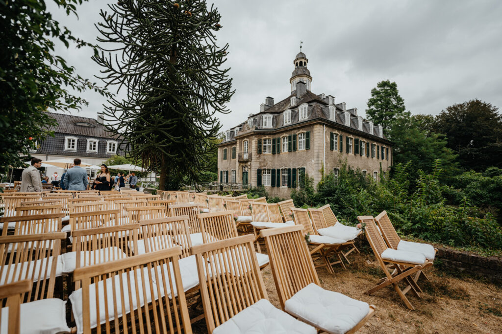 Die Evangelische freie Trauung unter dem freien Himmel am Schloss Hackhausen war was ganz besonderes. Für mich als Hochzeitsfotografin ist eine Trauung draußen viel schöner zu fotografieren. Es hat alles gepasst, das Wetter, die lächelnden Gäste, die schönen vintage Stühle und Deko. Eine Hochzeit mit Schloss Hackhausen im Hintergrund sah wunderschön aus.