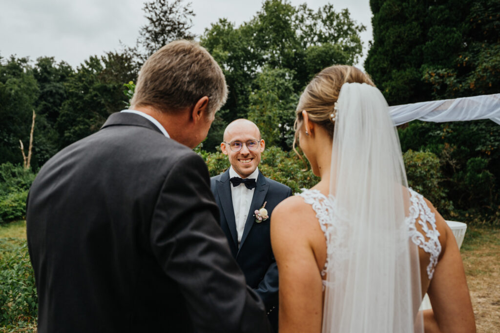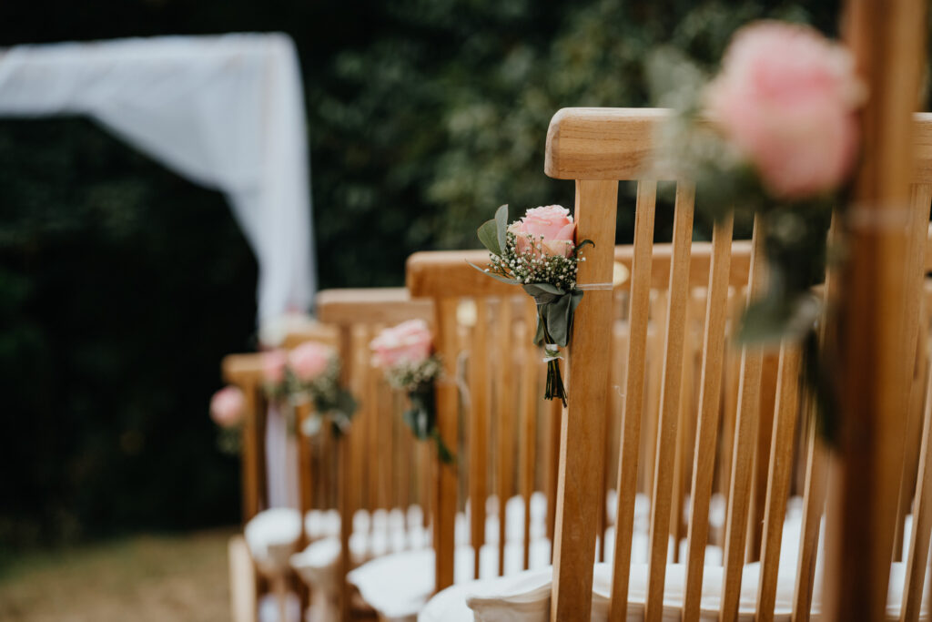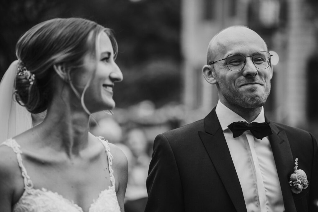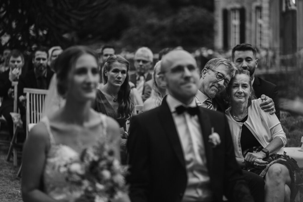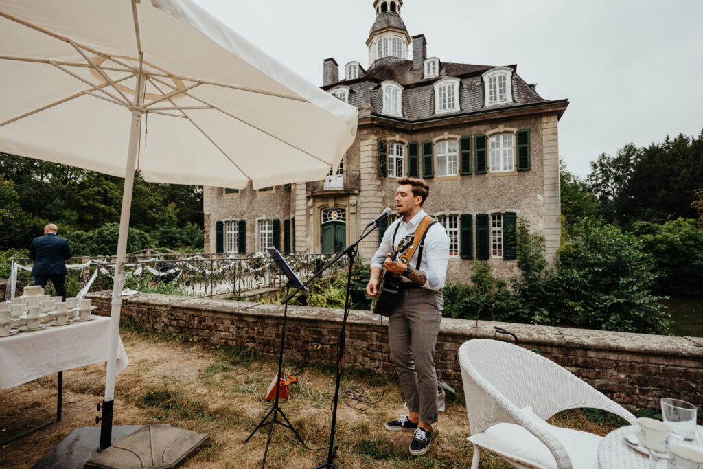 Die Evangelische freie Trauung unter dem freien Himmel am Schloss Hackhausen war was ganz besonderes. Für mich als Hochzeitsfotografin ist eine Trauung draußen viel schöner zu fotografieren. Es hat alles gepasst, das Wetter, die lächelnden Gäste, die schönen vintage Stühle und Deko. Eine Hochzeit mit Schloss Hackhausen im Hintergrund sah wunderschön aus.