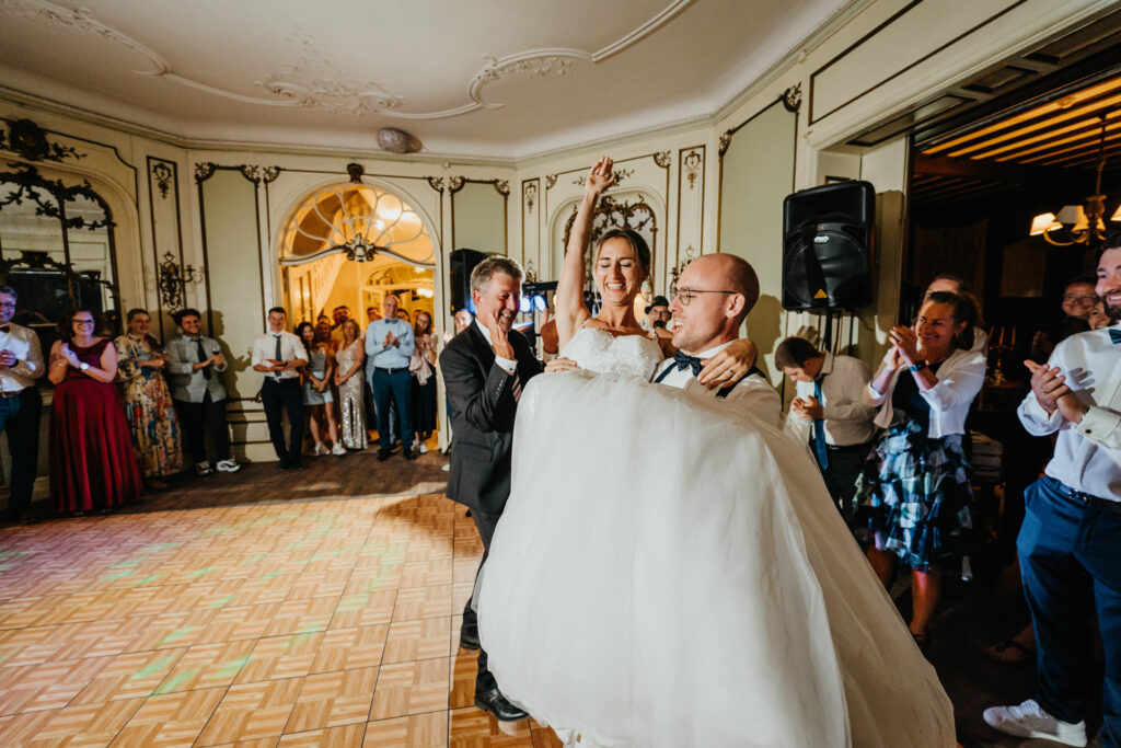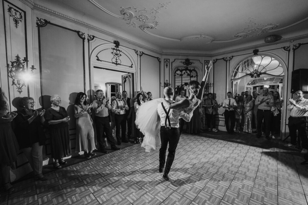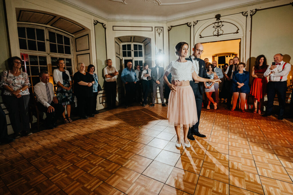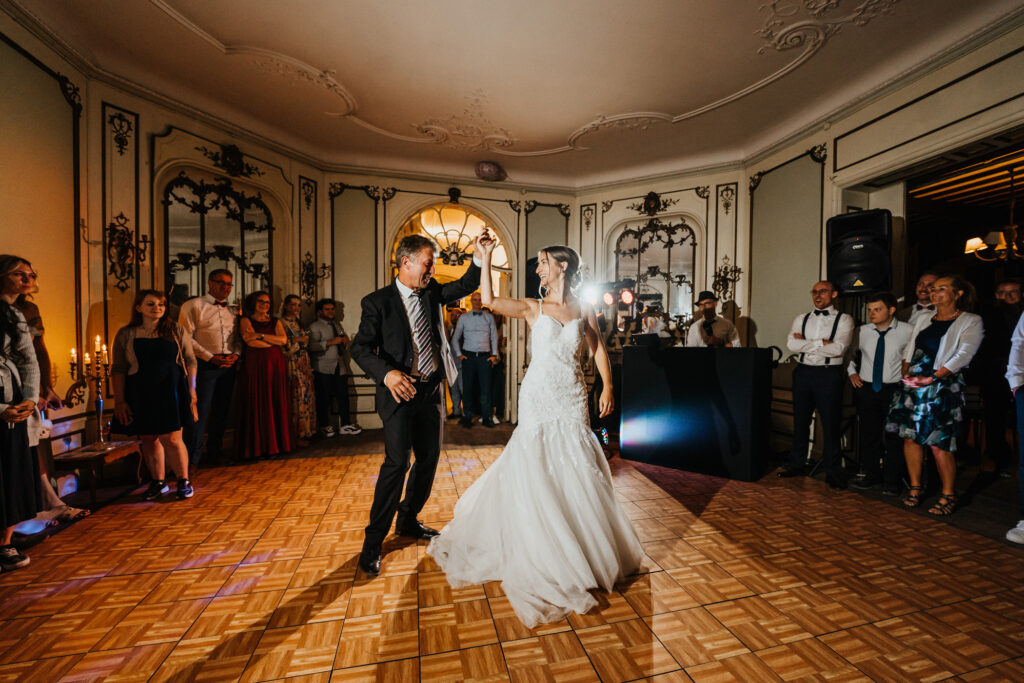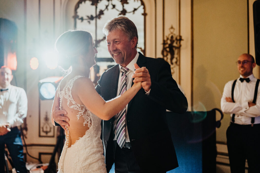 Abends ging es weiter mit Reden, ein paar Spielen und schon ging es auf die Tanzfläche. Aber der erster Tanz war ein sehr emotionaler Vater & Tochter Tanz . Die Braut hat sich dann umgezogen und dann gab es den ersten Tanz mit ihren Ehemann .